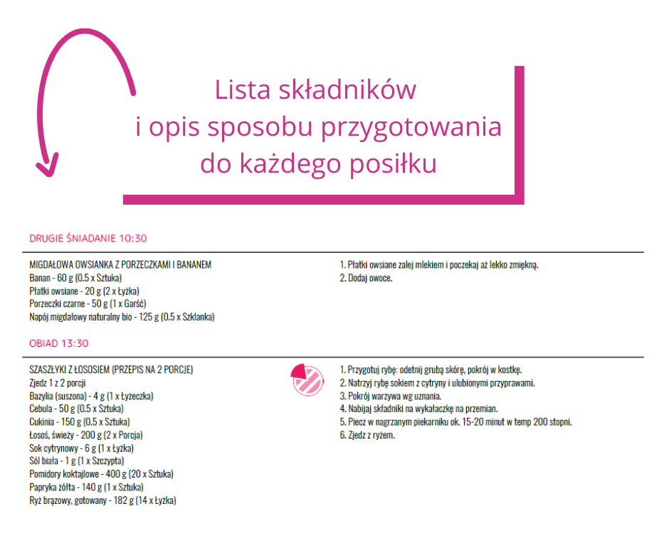 🔸 Dokładny opis przygotowania każdego posiłku i listę składników w gramach oraz miarach domowych.